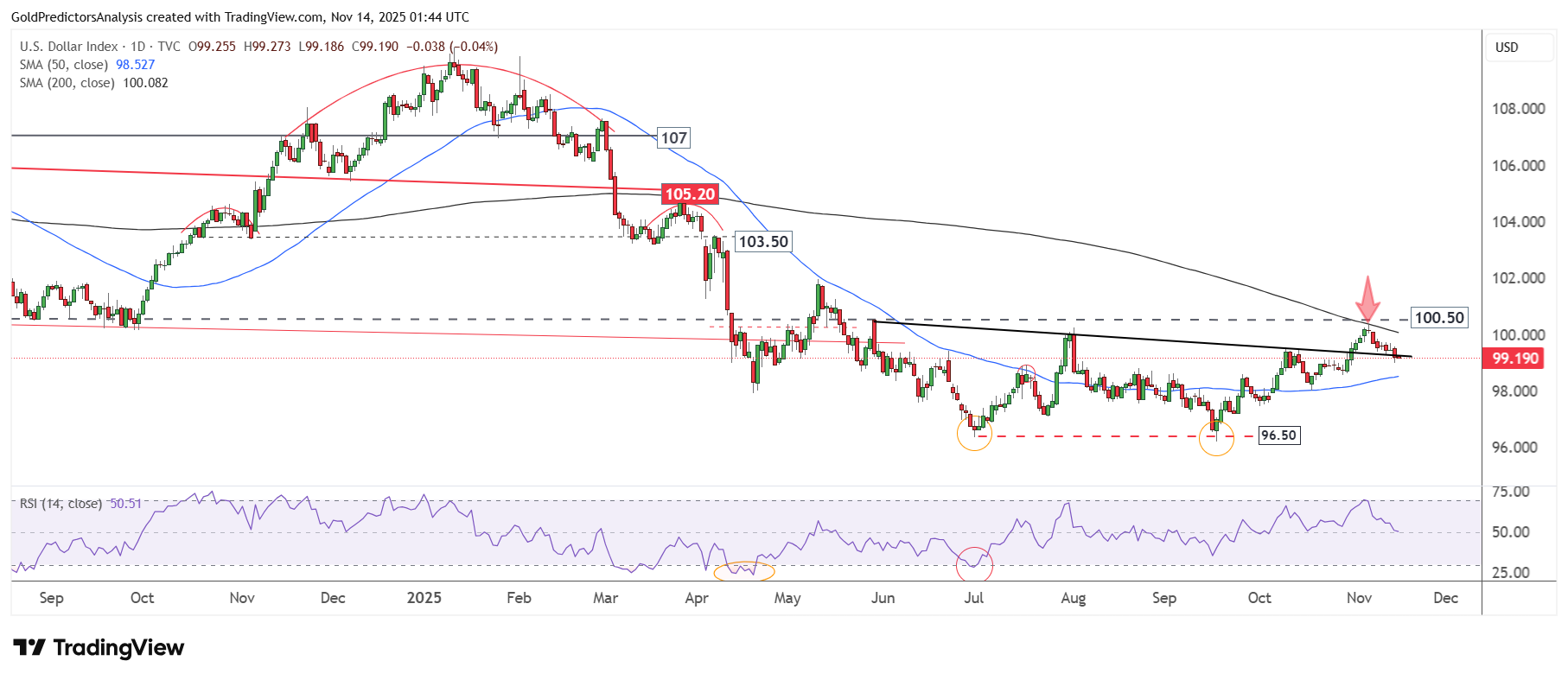The daily chart for the US dollar index shows that the index has formed strong resistance at the 200-day SMA at 100.50 and continues to move lower.
