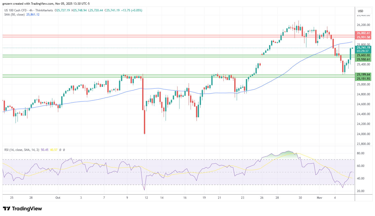 NASDAQ climbed above the previous resistance at 25,550 – 25,600 and is heading towards the 50 MA at 25,861. A move above the 50 MA will push NASDAQ towards the resistance at 25,950 – 26,000.