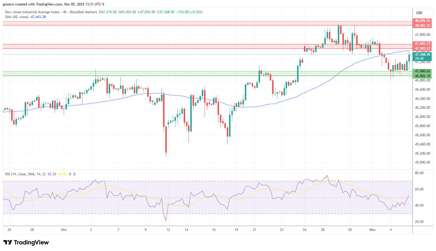 From the technical point of view, Dow Jones settled above the support at 46,900 – 47,000 and is moving towards the resisistance level at 47,500 – 47,600. A successful test of the resistance at 47,500 – 47,600 will open the way to the test of the next resistance at 48,000 – 48,100. RSI is in the moderate territory, so there is plenty of room to gain momentum in the near term.