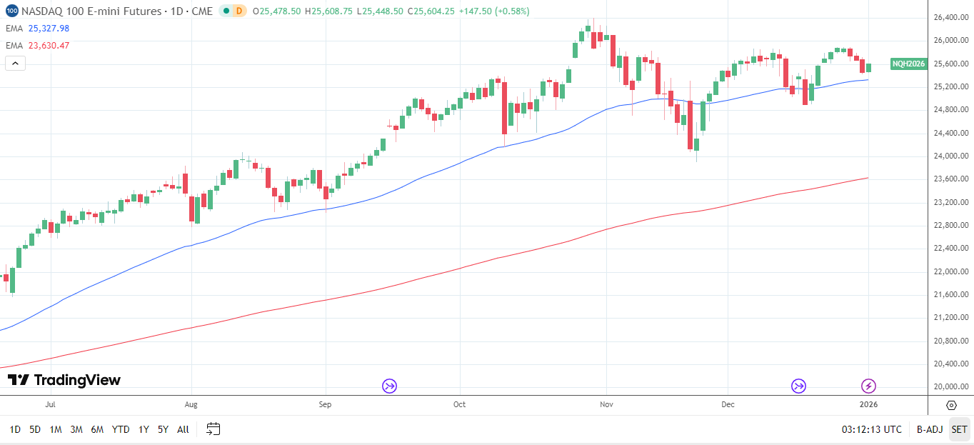 - US stock futures opened 2026 higher in Asia as Nasdaq 100 E-mini eyed a rebound, supported by risk-on sentiment and easing yen fears.