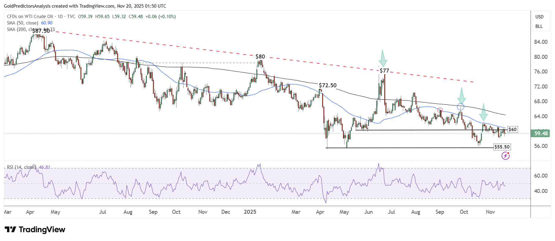 The daily chart for WTI crude oil (CL) shows that the price is consolidating below the 50‑ and 200‑day SMAs, indicating negative price action. The recent consolidation around the $60 area increases uncertainty for the next move. A break below the $58 region could push the price toward the $55 area.