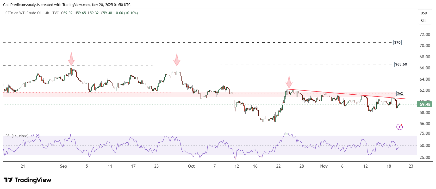 The 4-hour chart for WTI crude oil shows consolidation below the $62 level, with repeated failures to break above it. The price action remains bearish, as highlighted by the red downward trendline.