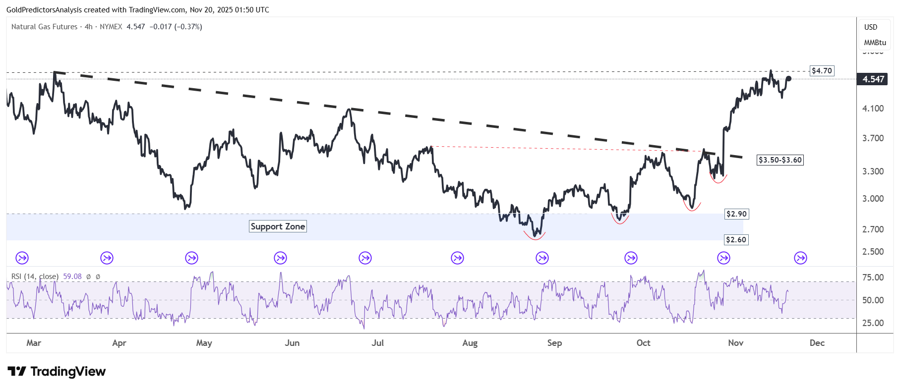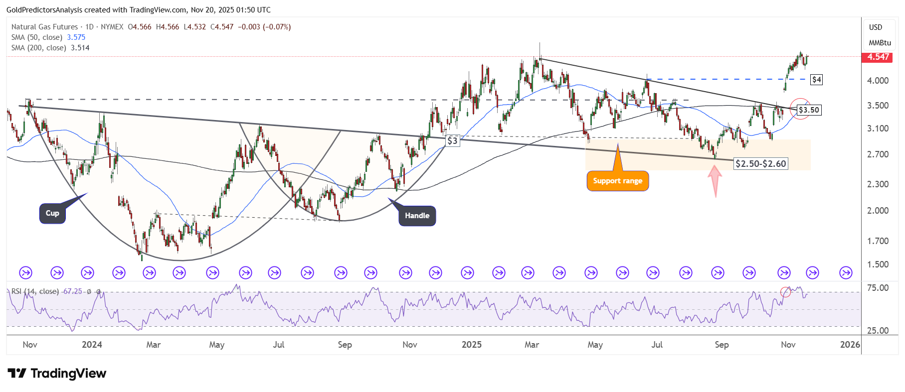 The emergence of a cup-and-handle pattern, followed by a retracement toward long-term support and a rebound toward the $5.00 region, suggests a potential shift toward a stronger long-term uptrend in natural gas prices.