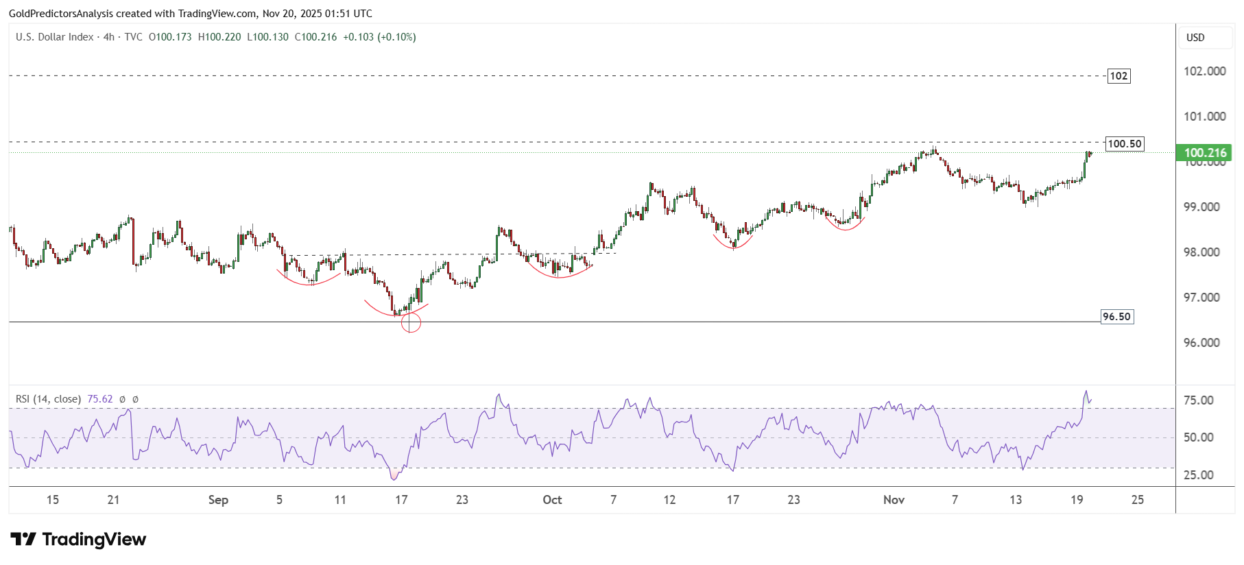 The 4-hour chart for the U.S. Dollar Index shows strong consolidation between the 96.50 and 100.50 levels. A breakout above or below this range will likely determine the next significant move.