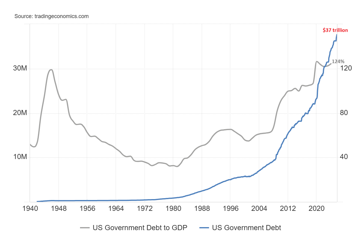 This structural shift reflects a broader loss of trust in fiat currencies. Sovereign debt has surged, and inflation is now viewed as a tool to manage debt by inflating nominal GDP. The chart below shows that the US public debt has surged over $37 trillion, with an increase of over $400 billion this month alone, pushing the debt-to-GDP ratio to 124%. This ratio is near the pandemic-era highs.