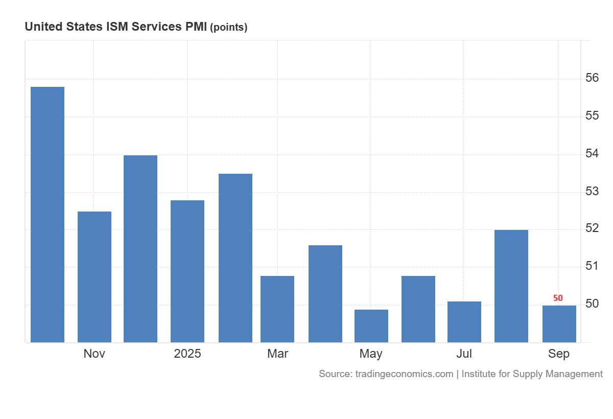 The chart below shows that the September ISM Services PMI dropped to 50.0, signalling stagnation. The New Orders index fell to 50.4%, pointing to a weakening outlook.