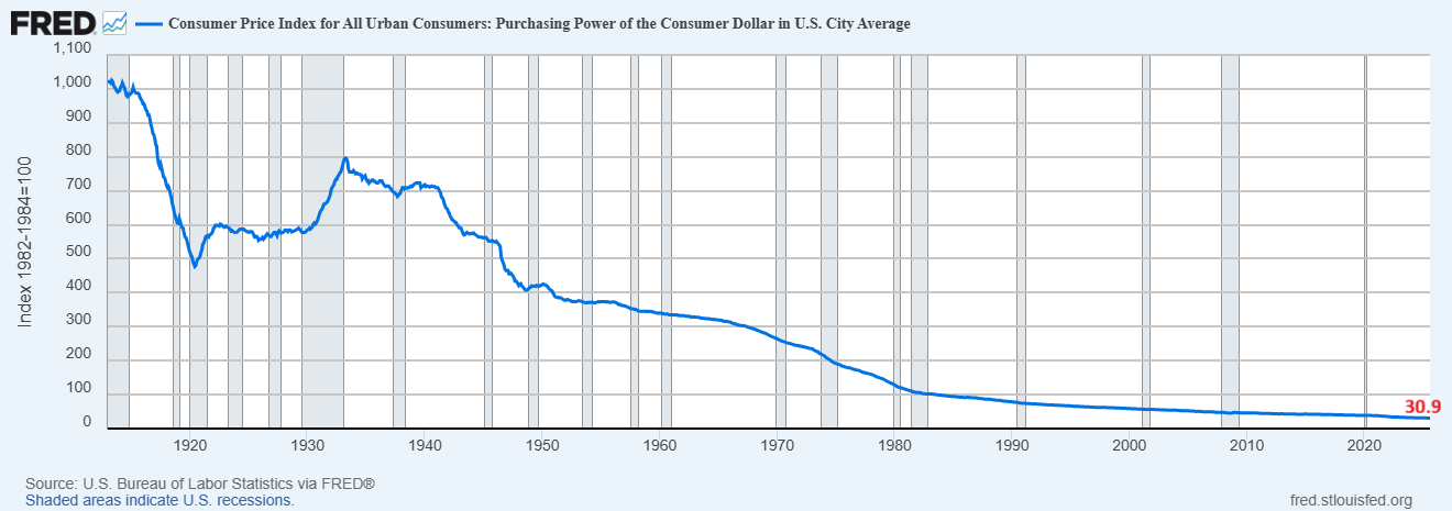 The long-term data confirms the structural weakness of the U.S. dollar. The chart below shows that the CPI purchasing power index has fallen from 796 in April 1933 to just 30.9 in August 2025, which is a significant decline in purchasing power. This decline is even more when measured against gold.