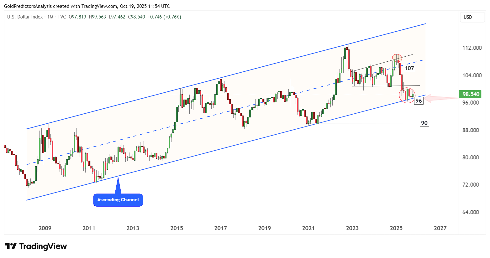 The chart below shows the long-term picture for the U.S. Dollar Index, which is rebounding from a key support zone. If the index fails to break below the 96 level, it could trigger a correction in gold prices. However, a break below the 96 level will trigger a strong drop to the 90 level.