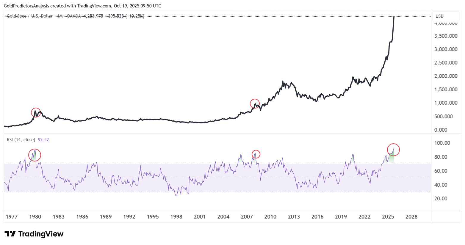 From a technical analysis viewpoint, gold is facing a clear risk of a pullback. The chart below shows that the RSI has reached levels not seen since the 1980s, indicating that gold has entered extremely overbought territory.