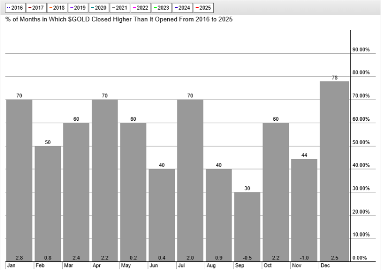 The chart below shows the seasonal trend over the last 10 years, highlighting that January, April, and December have consistently been positive months, where gold prices closed higher than their opening levels. October also shows a moderately bullish tendency, with a 60% probability of a positive close.