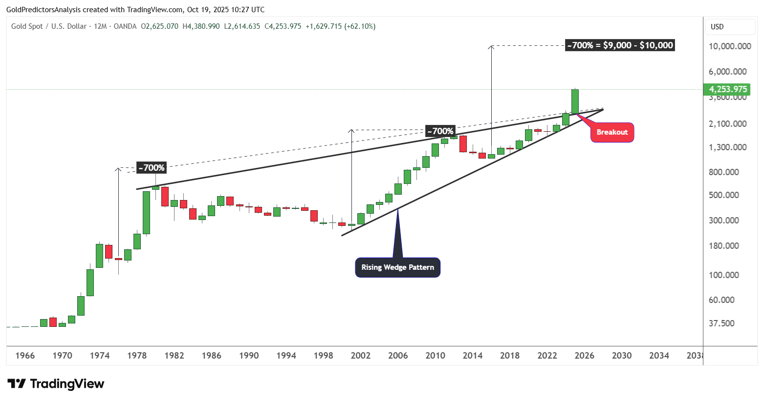 However, the long-term trend remains strongly bullish. The chart below confirms a major structural breakout in the gold market in 2024, indicating that prices could advance toward the $9,000–$10,000 range. This range is a measured move projected from this breakout pattern.