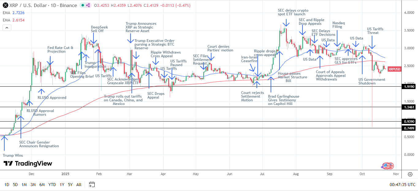 XRP fell 2.95% on Tuesday, October 21, partially reversing the previous day's 4.47% rally to close at $2.4242. The token underperformed the broader crypto market, which dropped 2.13%. The pullback left XRP trading well below the 50-day and 200-day Exponential Moving Averages (EMAs), reaffirming a bearish bias.